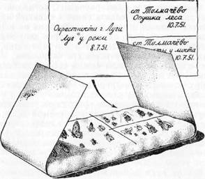 Под матрасик, как показано на рисунке. 7, подкладывают полосу бумаги такой же ширины, как слой ваты, но длиннее его. За концы этой полосы вату с насекомыми легко вынуть из коробки, а когда вата уложена в коробку, то концы бумаги заворачивают на вату с обоих концов и накрывают насекомых. Так как сборы, особенно если они произведены в малоисследованных местах, могут иметь научное значение, то полезно прикладывать к сборам запись, где, когда и кем насекомые пойманы. Для этого на слой с насекомыми кладут такой же величины лист писчей бумаги, где и указываются все необходимые сведения. Если отдельным сбором занят не весь матрасик, а только часть его, то эту часть отделяют куском положенной на вату черной или цветной нитки, а на покрывающем листке следует начертить карандашом, соответственно нитке, линию. Тогда каждая запись делается только к определенной части (рис. 7).