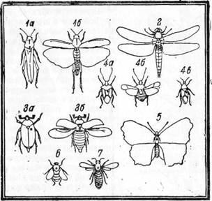 Прежде всего очень нужна коллекция, которая сразу дает понятие, какие животные относятся к насекомым (рис. 8). Главные отряды насекомых. Собирая всевозможных насекомых, следует составить общую коллекцию главных отрядов этого класса животных. Она показана на рисунке 38. Для изготовления такой коллекции нужен довольно большой кусок стекла: примерно 30 см в длину и 20– 25 см в ширину. По величине стекла сделайте плоский ящик. Для этого необходим кусок картона. Если величина стекла 30х20 см, то картон должен иметь размер 34х24 см; если размер стекла 30х25 см, то величина картона должна быть 34х29 см. Ящик сделайте так, как показано на рисунке 22. На картоне обведите карандашом стекло. Вокруг прямоугольника, который при этом вы нарисовали, обведите рамку в2 см шириной и еще другую – шириной в 5 см. По всем линиям, где надо согнуть картон, проведите надрезы ножом и гните стенки (от надреза). Когда ящик будет сшит, наложите в него белую вату. Теперь раскладывайте на вату насекомых так, как на рисунке. 38. Слева в верхнем углу лежат таракан и кобылка. Полезно прибавить сюда зеленого кузнечика, а для южных местностей – еще и медведку. Над этими насекомыми этикеточка: «Прямокрылые». Под прямокрылыми поместите стрекоз. Настоящая стрекоза имеет более короткое широкое тело, но чаще стрекозы с длинным тонким брюшком: коромысло большое и коромысло малое. Очень красивы летающие над водой стрекозы-красавки с металлической темно-синей окраской крыльев. Под стрекозами помещают клопов. Бывают очень красивые цветочные клопы, будто покрытые зеленой эмалью; бывают коричневые. Очень интересны водяные клопы – водяной скорпион, гладыш, скользящие по поверхности воды длинноногие водомерки.