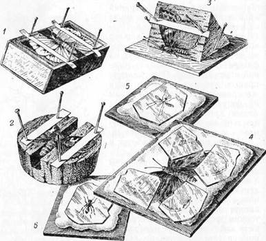 Рис. 11. Расправление насекомых на временных расправилках: 1 – на спичечной коробке; 2 —на большой пробке с желобком;3 – на куске пробки; 4, 5, 6 —на дощечке с ватным слоем.