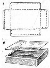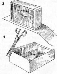 Рекомендуем набрать побольше готовых коробок; тратить время на устройство самодельных открывающихся коробок не следует. Любую конфетную или папиросную коробку вы можете превратить в коробку под стеклом. Возьмите кусок оконного стекла размером с поверхность крышки, прорежьте в ней отверстие, оставив закраины по 0,5 см, затем оклейте коробку со стеклом. Однако фабричные коробки со всякими надписями и рисунками, оставляемые без стекла, надо оклеить. Канты не заворачивают внутрь коробки, а укладывают с одной стороны на крышку, с другой – на дно. Потом вырезают листок размерами немного меньше крышки и наклеивают на нее сверху. Когда коробка просохнет, острым ножиком или лезвием безопасной бритвы делают надрез по линии, где под бумагою находится граница между коробкой и крышкой. Коробка опять будет открываться.