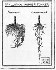 Осенние отчетные выставки работ юннатов стали хорошей традицией, но об оформлении их часто не очень-то заботятся. Выставки иногда напоминают осенний рынок или прилавок овощного магазина. Но одно только созерцание в натуральном виде хорошо знакомых ребятам капусты, свеклы, моркови, яблок и даже кукурузы не будит мыслей и скоро забывается. Большой интерес вызовут различные препараты, где можно показать, как шла работа, какие наблюдения сделали юннаты и какие знания и навыки они усвоили; приведем некоторые примеры: Корень томата с прищипкой (опытной) и без нее (контрольный) (рис. 30); то же с рассадой капусты; влияние окучивания (на примере капусты) на образование придаточных корней; влияние азотистого удобрения на лен (взять растения двух– и трехнедельного возраста); влияние прищипки стебля огурца на развитие плетей; баклажаны, выращенные при мульчировании (мульчевой бумагою или толем). Подобно этим примерам можно сделать препараты и по другим опытам. Из десятков растений каждой делянки можно будет выдернуть один-другой экземпляр, сделать для растений двух делянок общий гербарный лист и показать различия этих двух форм. Вид пособия – работа вторая. Накопайте пырея с корневищами. В первой половине лета, когда эти растения усиленно разрастаются, нарежьте кусочками корневища пырея, с кустиками на них. Заготовьте их штук пятьдесят. Половину засушите в прессе, а половину посадите в грядку. Через месяц их можно выкопать из земли и тоже засушить в прессе.