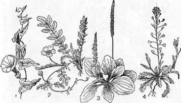 1 – вьюнок; 2 – гусиная лапка; 3 – подорожник; 4 – пастушья сумка.