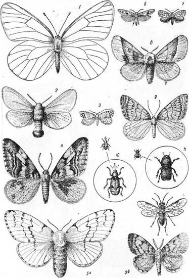 1 – боярышница; 2 – златогука; 3 – яблоневая плодожорка; 4 – обдирало, 5 – непарный шелкопряд (5а – самка, 56 – самец); 6 – плодовая моль; 7 – листовертка; 8 – кольчатый шелкопряд; 9 – зимняя пяденица; 10 – яблоневый слоник; 11 – сливовый короед; 12 – пилильщик.