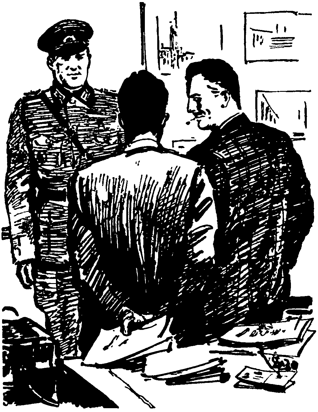 …Несмотря на очень ранний час, в конференц-зале главного управления находились все руководящие работники во главе с полковником Рокком. Дежурный офицер попросил заикающегося от волнения Коллинза обождать у телефона, а сам пошёл докладывать Рокку. С первых же слов Коллинза полковнику стало ясно всё до конца, а одного движения руки Рокка оказалось достаточным, чтобы тревога передалась остальным сотрудникам. Один за другим они подымались со своих мест, видя, как гримаса гнева сводит лицо полковника. Наконец Коллинз остановился, чтобы перевести дух, и тогда полковник Рокк, несколько раз открыв и закрыв рот, точно рыба, вытащенная из воды, заревел не своим голосом: — Вы идиот, Коллинз! Вы слышите? На вашем месте я немедленно бы застрелился! Тотчас же! Он бросил трубку и взглянул прищуренными глазами на остальных офицеров. — Капитан, — обратился он к одному из офицеров, — немедленно арестуйте Коллинза… — Помолчал и повернулся к другому: — Майор Грин, известите генерала… Полковник прошёл в соседнюю комнату и нажал кнопку селектора. Во всех дежурках всех отделений, подчинённых главному управлению, раздался сигнал тревоги. Рокк прокашлял в микрофон: — Общая тревога! Земля и небо! Земля и небо! Границу закрыть! Он выключил селектор и отдал приказ третьему офицеру: — Немедленно приготовьте описание личности Хансена и передайте фототелеграммами в армию, военно-воздушным силам, военной разведке, пограничной службе бундесвера, немецкой полиции!