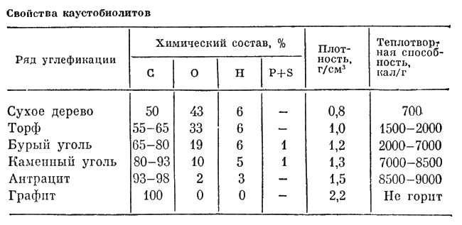 Несколько сот миллионов лет назад зона тропического климата на Земле доходила до широт Шпицбергена и выше. Тепло и высокая влажность способствовали буйному росту растений, в том числе громадных деревьев. В связи с отсутствием в этот период (названный впоследствии геологами карбоновым, или каменноугольным) лесной и целлюлозно-бумажной промышленности деревья умирали, падали и на их остовах вырастали новые деревья. Так было много раз, пока геологические сдвиги и осадочные породы не погребали многометровые толщи остатков растений под слоем горных пород. Так под действием высокой температуры и огромного давления, без доступа кислорода происходила углефикация растительного материала, его обескислороживание и обеднение водородом. По мере протекания этого процесса исчезали узнаваемые детали строения исходных растений, заметные еще в торфе, буром угле и немного в каменном, и образовывался сплошной антрацит, а затем и кристаллический графит; последний на 100 % состоит из углерода (см. таблицу). Угли (каустобиолиты), как и другие породы органического происхождения— янтарь, жемчуг, ракушечник, перламутр, не строго попадают под определение «минерал», находясь где-то вблизи условной границы, разделяющей органический и неорганический миры. Условность этой границы подтверждается тем, что графит может быть и органического, и неорганического происхождения.