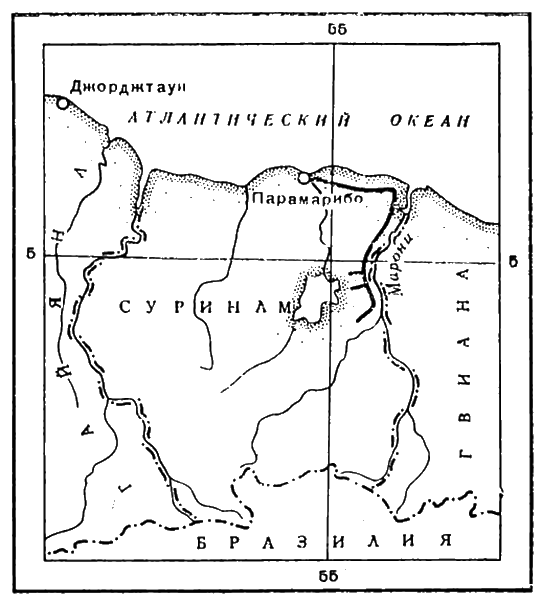 В мае 1980 г. в Секретариате ООН мне предложили командировку по делам Департамента технического сотрудничества в Суринам. Поездка обещала быть очень интересной, тем более что в этой маленькой и экзотической стране никому из работавших со мной сотрудников прежде бывать не доводилось. Прельщала также возможность выезда в джунгли для осмотра известных в стране проявлений рудной минерализации. Как всегда перед поездкой, нужно было порыться в книгах и почитать все, что было написано раньше о геологии этой страны, а также встретиться с нью-йоркскими геологами, может быть, кто-нибудь сможет рассказать о Суринаме что-нибудь интересное. Сведений в книгах оказалось до обидного мало. Писали только о знаменитых суринамских бокситах, больше, кажется, ничто никого не интересовало. Рассказать мне толком о месторождениях Суринама тоже никто не смог, лишь из журналов удалось выудить некоторые интересные данные о присутствии в стране рудных проявлений и россыпей золота, олова, редких металлов и некоторых других руд. Среди других сообщений заинтересовала случайно обнаруженная короткая заметка о том, что кто-то видел привезенный из Суринама гидденит. Правда, там умалчивалось о местонахождении этого самоцвета, таким образом большой информационной ценности эта заметка не имела. Гидденит — прозрачная зеленая разновидность природного силиката алюминия и лития — сподумена, является весьма редким минералом. Кроме того, сподумен легко подвержен выветриванию, и оставалась загадкой, как он смог уцелеть в условиях влажных тропиков Суринама. В общем я отнесся к этому сообщению без особого доверия, но в книжечку все-таки записал. Гораздо интересней была информация о золоте, которое в течение уже многих лет понемногу добывалось в чащобах суринамских джунглей. Подготовка к поездке заняла неделю, в течение которой моя записная книжка заполнялась многочисленными сведениями, которые могли оказаться полезными при выполнении задания в Суринаме. Нужно сказать, что, продумывая план поездки, я почти никогда не вспоминал о гиддените. Вопрос о самоцветах вообще не входил в программу командировки, да и сведения о нем были уж слишком неопределенными. Прямого сообщения между Нью-Йорком и Суринамом нет. Приходится сначала лететь на Тринидад, садиться в столице островного государства Тринидад и Тобаго — Порт-оф-Спейн, ждать неопределенное время и на самолете компании «Эр Мартиника» перелетать в Парамарибо — столицу Суринама. Несмотря на то, что самолет типа «Каравелла», принявший на борт пассажиров в Гайану и Суринам, был очень старый и неуютный (даже вентиляция не работала — это в тропиках-то), мы прилетели в Парамдрибо в тот же вечер лишь с небольшим опозданием. Поселяюсь в отеле с довольно странным для Южной Америки названием «Краснопольский Парамарибо», но вполне приличным. Суринам — это небольшая страна, расположенная в северо-восточной части Южной Америки между двумя такими же небольшими странами — Гайаной с запада и Гвианой с востока. Гвиана до сих пор еще является французской колонией. С юга Суринам граничит с Бразилией. По оценке 1978 г. в стране проживало 450 тыс. жителей. При этом около 90 % от этого количества сконцентрировано в узком прибрежном поясе страны шириной всего несколько десятков километров. Далее к югу следует пояс малообитаемых влажных д