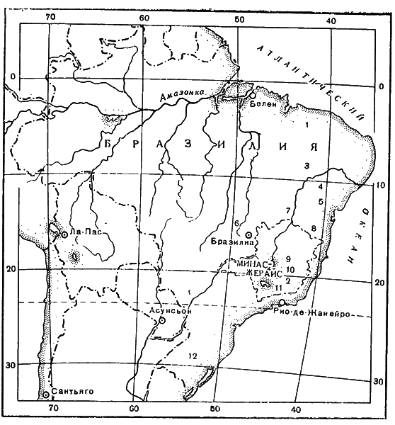 Месторождения самоцветов в Бразилии 1—Педро II (опал); 2 — Сан-Томе (кунцит); 3 —Крузейро (турмалин); 4 — Салининха (изулфуд); 5 — Якобина (аметист); 6 — Сан-Кристован (голубой топаз); 7 — Брейинхо (аметист и цитрин); 8 —Карнаиба Кампо Формосу (изумруд); 9 — Аракуаи (морганит); 10 — Санта-Мария (аквамарин); 11 — Оуро-Прету (топаз); 12 — Иран (цитрин и аметист)