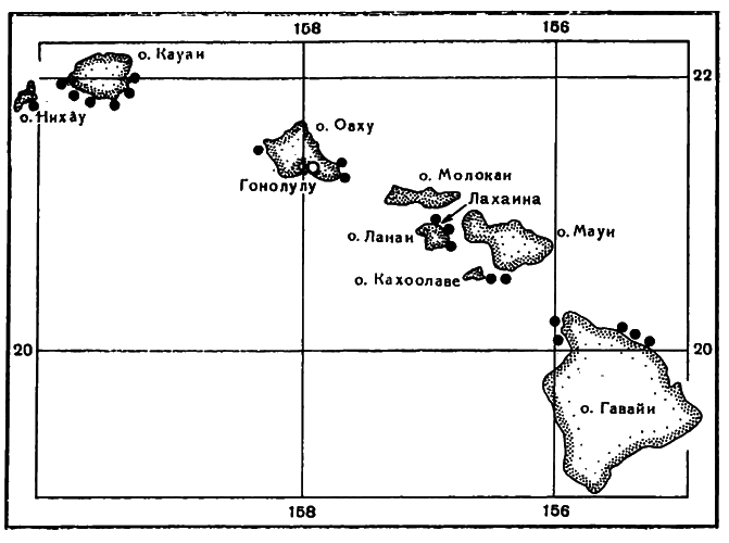 Районы распространения (черные кружки) благородных кораллов. Гавайский архипелаг
