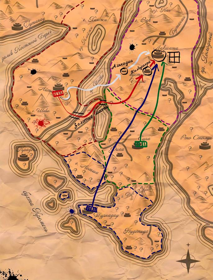 — Совсем скоро начнётся фестиваль Белого Крокодила. — начал Базиль. — Эксодий, ты отвлечешь внимание основных сил Лакшата — возьми в осаду ближайший город — идеальной целью будет Калбусахра, войско поведешь с юга, по Золотым мостам14.