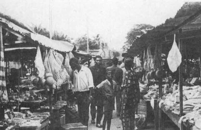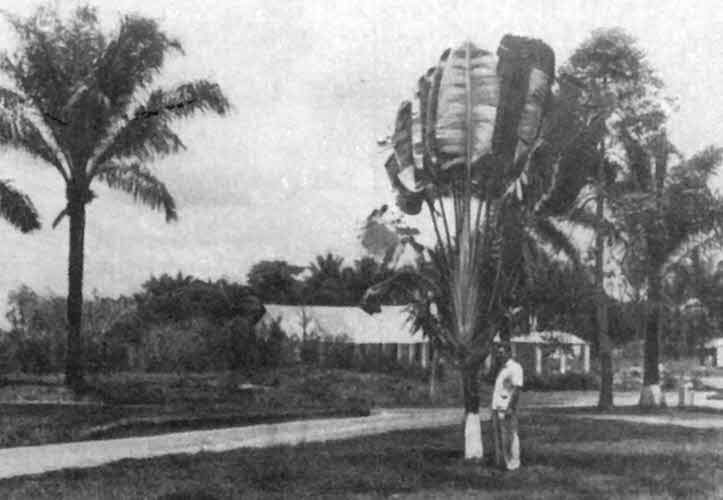 В Пуэнт-Нуаре мы жили в Центральном военном доме отдыха на берегу Атлантического океана. Мне запомнилось первое утро. Проснувшись, вышел на балкон и не знал, что подумать: перед глазами было бело, будто за ночь выпал снег. Не видение ли это? Протер глаза: по-прежнему было бело. Расстилавшийся перед моим взором белый морской песок был очень схож с только что выпавшим снегом. От океана нас отделяла заболоченная низина метров 150 шириной, густо заросшая травой, кустарником и изобиловавшая лягушками и комарами. Широкая аллея, окруженная зарослями бамбука, вела от дома отдыха к океану, на дикий пляж. Кольчатоузорные стволы бамбука, подобно гигантским стрелам, поднимались кверху, постепенно утончаясь, и приблизительно на высоте 10 м изгибались в виде дуги. Все мы слышали о феноменальной скорости роста бамбука. И путешественник, не знавший об этом по преданиям, попадал в затруднительное положение: вечером, перед сном, он вешал свою шляпу на вершину небольшого бамбука, а утром не мог ее достать: так сильно вырастал бамбук за ночь. — Интересно, — подумал я, — насколько легенды соответствуют действительности? На этой аллее приметил молодой бамбук 25 см высотой и решил за ним понаблюдать. Следил в течение двух недель и немало был разочарован: бамбук вообще не подавал никаких признаков роста. — Почему же бытуют эти красивые сказки о бамбуке? — рассуждал я. Но вскоре бамбук дал о себе знать. Проходя по аллее, обнаружил, что бамбук поднялся до 56 см. Через двое с половиной суток высота его достигла 90 см (скорость роста была примерно 13 см в сутки). В последующие двое суток он рос уже со скоростью 18 см в сутки. Прошло еще четверо суток. Средняя скорость роста оказалась 24 см в сутки. К этому времени высота бамбука достигла 340 см. Еще раз я замерил высоту бамбука через шестеро суток. Его высота оказалась 490 см. В этот промежуток времени он рос в среднем со скоростью 25 см в сутки. В шесть утра шагаю на работу. Ночью прошел дождь. Была сильная гроза, стены домов содрогались от грома. Косой дождь хлестал с такой силой и с таким остервенением, словно хотел все постройки сбросить в океан. Воздух насыщен озоном, дышится легко. Очень тихо. Алеет восток. Скоро появится солнце. Нет ни одной машины, ни одного прохожего. С обеих сторон меня окружают белые виллы с огромными верандами и деревянными решетками вместо окон. Около вилл обилие всевозможных экзотических деревьев: кокосовые и масличные пальмы, деревья путешественников, раскинувшие веером листья-весла, стройные эвкалипты и пышнокронные манго, пальмы со шпилями, напоминающими знаменитую Адмиралтейскую иглу в Ленинграде… Часам к десяти на веранде около открытой двери нашей комнаты появляются торговцы фруктами и овощами. Женщины, мужчины, мальчики и девочки предлагают бананы, ананасы, лимоны, манго, щавель, салат, огурцы, помидоры, лук, арахис, папайю. Одна партия торговцев сменяет другую. Немного позднее приходил полюбившийся нам Проспер — высокий стройный конголезец лет 18. Заглядывая в камеральное помещение, он произносил по-русски: «Есть хорошие огурцы, фасоль, люк, папайя». Родная речь действовала на нас магически: овощи и фрукты Проспера всегда быстро раскупались. В выходные и праздничные дни мы ездили за овощами и фруктами на Центральный базар. Там многолюдно, толпы людей снуют в разных направлениях. Пестрота на