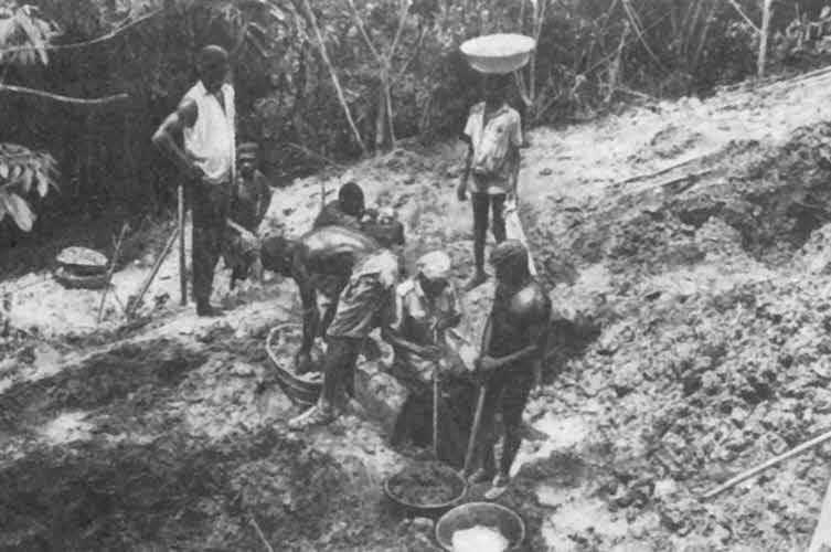 Нам было известно, что небольшие россыпи золота в Конго есть в западной части префектуры Кювет — в верховьях бассейна реки Ликвала, близ селений Келле и Мбомо; в префектуре Санга, у селений Весо и Сванке; в префектуре Ниари (на плоскогорье Шайю), близ селения Майоко; в префектуре Квилу (в горах Майомбе), в окрестностях селений Сунда, Какамоэка и Димоника. Месторождения разрабатывались двумя французскими компаниями с начала 40-х до середины 60-х годов. Наибольшая добыча благородного металла достигла в 1943 г., она составила 787 кг. В дальнейшем количество добываемого золота постоянно убывало и в 1964 г. составило 78 кг. Компании прекратили свою деятельность. После этого правительство Конго разрешило старательскую деятельность, которая широко развернулась по всей стране. Но старатели должны были сдавать все добываемое ими золото государству через официальных скупщиков. Однако государственная цена за грамм золота была низкой, и старатели стали продавать золото по более высокой цене перекупщикам. И поплыло конголезское золото в другие страны, что, естественно, наносило немалый ущерб казне. Старательская добыча золота велась преимущественно в окрестностях селений Димоника, Какамоэка, Майоко и Келле. Эксплуатировались легкодоступные неглубокие месторождения в долинах рек и ключей. Такую бессистемную отработку россыпей принято называть хищнической. Отработка россыпей старателями никем не контролировалась. Перед советскими геологами были поставлены следующие задачи: оценить известные россыпи хребта Майомбе и выявить новые с промышленными концентрациями золота, определить общие перспективы золотоносности хребта Майомбе. Кроме того, наши геологи постоянно обучали конголезских рабочих методике отбора и промывке проб на золото, ведениюдокументации шурфов и т. д. Речная сеть хребта Майомбе представлена двумя крупными реками — Квилу и Лоеме (впадающими в Атлантический океан) и их многочисленными притоками. Россыпи золота содержатся как в ручьях (например, в Кяби длиной 3 км), так и в реках (например, в Лукенене длиной более 50 км). В результате работ 1966–1968 гг. в бассейне Квилу был выделен золотоносный участок Сунда — Какамоэка, а в бассейне Лоеме — Димоника. На участке Сунда — Какамоэка россыпи с промышленным содержанием золота выявлены на реках Момби, Люба и Люниока. Россыпи имеются в притоках Люниоки — реке Люлимба и ручьях Кибусси, Луволо и Кибондо. Установлена золотоносность рек Манджи, Мами, Лукемба и Пиласси. На участке Димоника россыпи найдены в реке Лукенена и по ее правому притоку Мидумву, а также во впадающих в Мидумву ручьях Мантину (длиной 5 км) и Кибука. Содержание золота в галечниках на участках Сунда — Какамоэка и Димоника колеблется от 1,1 до 1,9 г/м3. Проба золота высокая и варьирует от 912–937 до 950[18]. Размеры золотин 1–3 мм. В россыпи Кяби старатели нашли два самородка весом 52,4 и 261 г. В результате поисковых и разведочных работ в горах Майомбе было подсчитано, что запасы золота составляют около 12 т. Из них свыше 6 т можно извлекать механизированным способом (4 т на Сунде и 2 т на Димонике). В 1973 г. была создана компания «Сосьете насьональ де Мин де Сунда» по добыче золота. В 1976 г. началась эксплуатация россыпей золота на участке Сунда — Какамоэ-ка. В 1982 г. мне пришлось объясниться с заместителем министра геологии по поводу этих россып