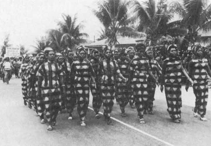 Мое знакомство со столицей Народной Республики Конго — Браззавилем (население примерно 450 тыс. человек) началось с веселого эпизода. Во время прогулки по зоопарку я остановился у вольера с двумя буйволами. Навожу фотоаппарат на одного из них. Зверь с яростью бросается на меня, со всей силой ударяя рогами по решетке. Непрочная решетка зашаталась, и я, напуганный, отбегаю в сторону. Мои спутники, находясь по соседству около мирных антилоп, заразительно хохочут. Смотрю, буйвол вроде бы успокоился, мирно щиплет траву. С некоторой робостью снова подхожу к вольеру, осторожно поднимаю фотоаппарат, и буйвол снова бросается, с еще большим остервенением вонзая рога в решетку… В третий раз я не стал испытывать судьбу. А крокодилы вели себя спокойно. Несколько огромных чудовищ, вылезших из воды, медленно ползали по траве за невысокой бетонной оградой и не обращали на нас никакого внимания. Но вот кто-то из посетителей дотрагивается до чудовища палкой: раскрывается огромная пасть и так лязгает зубами, что по телу пробегают мурашки. Ряд клеток с обезьянами… Тут и скачущие длиннохвостые мартышки, и мирно сидящие мандрилы, и степенные шимпанзе. Шимпанзе просовывают через решетку передние лапы и ждут подачки, глядя на посетителя по-человечьи грустными глазами. А вот очень трогательная семейная сцена: мать-шимпанзе крепко прижимает к себе детеныша, словно боясь, что его кто-то отнимет. Из зоопарка идем на берег Конго. Браззавиль расположен на правом берегу реки, у ее расширяющейся части Стэнли-Пул, на противоположном берегу — Киншаса, столица Республики Заир. Центр города утопает в зелени. Вдоль широких асфальтированных улиц тянутся ряды пальм — кокосовых, увешанных могучими плодами, и стройных масличных; очень украшают улицы манго с пышными кронами, акации, сплошь усыпанные ярко-красными цветами. Здесь расположены административно-правительственные и финансовые учреждения. Пастеровский институт, соборы и гостиницы. Одна из гостиниц — отель «Космос» — построена с помощью Советского Союза. Это красивое воздушное здание, сверкающее широкими окнами-витринами. С помощью Советского Союза построена и научно-исследовательская ветеринарная лаборатория — первое подобного рода учреждение в Центральной Африке. Его значение для страны огромно: ведь оно позволяет развивать животноводство на научной основе, чего раньше никогда не было. К центральной части города примыкают переселенные кварталы Баконго и Пото-Пото. По имени последнего квартала получила название всемирно известная художественная школа. Ее основатели — выдающиеся конголезские мастера живописи — начинали свою творческую деятельность в Пото-Пото. Живопись этой школы поражает зрителя буйством фантазии и необыкновенным сочетанием красок. Картины очень своеобразны и изумительны по своей красоте. Сейчас художественная школа размещается в стилизованном под африканскую хижину помещении на площади Мира. Полдень. Нестерпимый зной. Жизнь в городе замерла. Закрылись магазины, не слышно шума автомобилей, почти не видно пешеходов. А мы наконец-то добрались до реки Конго. Стоим на правом берегу, у переправы, и любуемся ее полноводностью[1], ее величаво-спокойным течением. Конго — одна из величайших рек нашей планеты. Ее длина 4320 км, площадь бассейна 3,7 млн км2. По длине среди африканских рек 