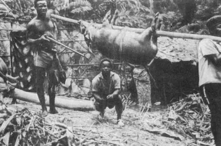 Конголезцы едят все, что дают джунгли: травы, листья, плоды, мышей, лягушек, крокодилов, змей, антилоп и обезьян. Но основная их пища — маниока. Маниока — это кустарник с клубневидными корнями продолговатой формы, весом от 1–2 до 5 кг каждый. Клубни созревают через полтора года после посадки. Когда их выкапывают, тут же сажают черенок, отрезанный от верхушки растения. Существуют две разновидности маниоки — горькая и сладкая. Большим распространением в Конго пользуется горькая маниока, быстрее вызревающая. Собранную горькую маниоку в пищу употреблять нельзя: она ядовита, поэтому ее вымачивают в воде в течение четырех-пяти дней, потом очищают от кожуры и сушат на солнце. Только после этого маниоку можно употреблять в пищу. Высушенную маниоку размалывают в муку, которая называется маниоковой или тапиоковой. Из муки выпекается хлеб, готовятся супы и другие блюда. В отряде — два охотника, которые снабжали нас дичью: антилопами, газелями, обезьянками (преимущественно мартышками), дикобразами. Дичь не свежевалась, а опаливалась над костром, разрубалась на куски и раздавалась рабочим. Затем куски мяса либо варились, либо пеклись на углях. Если мясо не съедали, оно коптилось над костром и в дальнейшем шло в пищу в копченом виде или после дополнительной варки. Как-то охотники принесли на палке большого, килограммов на 60, мандрила-самца[3]. Сбежались все жители лагеря — взрослые и дети. Трогают мандрила за уши, за ноги, выдирают клочки шерсти. Общее ликование, шум, визг, радостные крики… Настоящий праздник. Один из охотников рассказал: — Я убил мандрила не на дереве, а на земле. На его теле была большая рваная рана. Я думаю, что он дрался с другим самцом, был побежден и изгнан из стада. Не опалив, мандрила разрубили на куски, и Габриель Нгуака раздал их рабочим. Наше меню состояло из мяса антилоп и всевозможных супов. Пробовали мясо мартышек, ели маниоку. Из муки выпекали хлеб, готовили лепешки, оладьи. Помню, как наш повар Шарль первый раз выпекал хлеб. Он вырыл яму и зажег в ней дрова. Когда образовалось достаточное количество углей, поставил на них формы с тестом. Хлеб получился сырой. Но, как говорится, первый блин комом. Следующую выпечку Шарль обещал сделать лучше, и сдержал слово. Наши охотники обычно охотились ночью с электрическим фонарем, укрепленным на лбу. Они прекрасно ориентировались в джунглях. Ни разу не было случая, чтобы хоть один заблудился. Каждый раз, когда охотники приносили дичь, меня поражали ее небольшие размеры: серая газель, например, размером с нашего зайца; дикобраз в сравнении с тем, что обитает в нашей стране, выглядит детенышем. В деревнях Конго пасутся взрослые козы ростом с козлят. — В чем же дело?Почему животные джунглей маленькие?