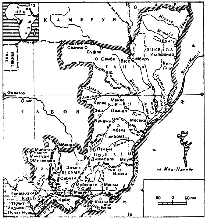 В Народной Республике Конго я занимался поисками алмазов. Конголезское правительство, пришедшее к власти после революции 1963 г., не знало, богата его страна алмазами или бедна. Нам, советским специалистам, и предстояло ответить на этот вопрос. Правда, контрактом предусматривалось провести исследования только в южной части республики, потому и рассказ будет идти именно об этой территории. Перед нами стояла также задача научить конголезцев вести поиски алмазов самостоятельно. В Африке я пробыл два года и девять месяцев, т. е. с середины декабря 1965 г. до середины сентября 1968 г. Перед отъездом из Москвы начитался всяких ужасов о джунглях: ядовитые змеи, мухи цеце, разносящие смертельную болезнь; реки, кишащие крокодилами; непроходимые заросли, нашпигованные ползучими тварями; невыносимая жара… Но поиски алмазов — моя профессия… Мне пришлось провести много дней в джунглях Конго южнее экватора — на плоскогорье Шайю и в горах Майомбе. Я проехал на газике сотни километров по саваннам, раскинувшимся между горами Майомбе и плоскогорьем Шайю, и вдоль побережья Атлантического океана. Так каково же оно, Конго, в котором мы, из советских специалистов, побывали первыми?