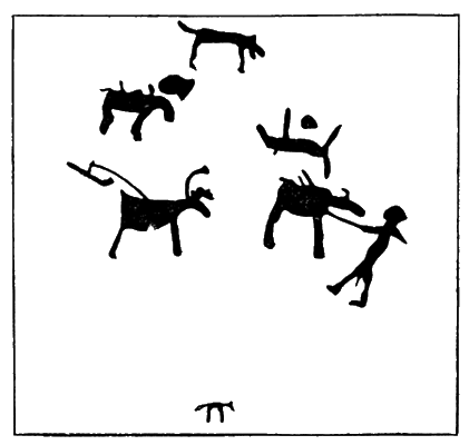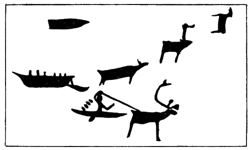 Рис. 1. Охота на плывущих оленей с лодок. На первом плане — охотник, пронзивший оленя гарпуном (или копьем). Петроглифы на скалах Пегтымеля (по Н. Н. Дикову, 1971)