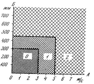 Рис. 5. График способности природных территориальных комплексов к самоочищению атмосферы в зависимости от скорости ветра и осадков 0 — почти нулевая способность к самоочищению; 1 — средняя способность к самоочищению; 2 — хорошая способность к самоочищению при скоростях ветра выше 5 м/сек и осадках более 450 мм/год А — скорость ветра в м/с: 1, 2, 3.. 7; Б — осадки в мм: 100, 200.. 500