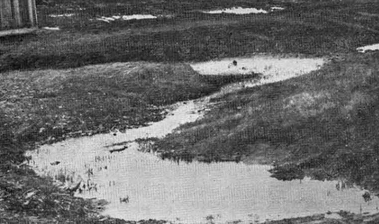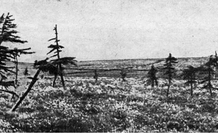 Рис. 4. Вид пригородной зоны, расположенной в 30 км от северного промышленного центра. Изменение теплообмена между атмосферой и почвой, вызванное запылением, привело к тому, что почва оттаяла на большую, чем прежде, глубину. В результате осела и деформировалась ее поверхность, усилились термокарстово-эрозионные процессы и солифлюкционное течение грунтов на склонах