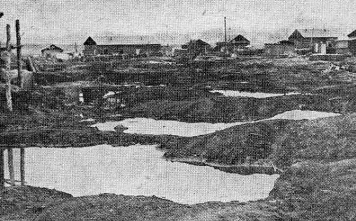 Рис. 12. Поселок, расположенный на сильно льдистых грунтах. В результате деформации поверхности разрушаются дома, грунтовые дороги