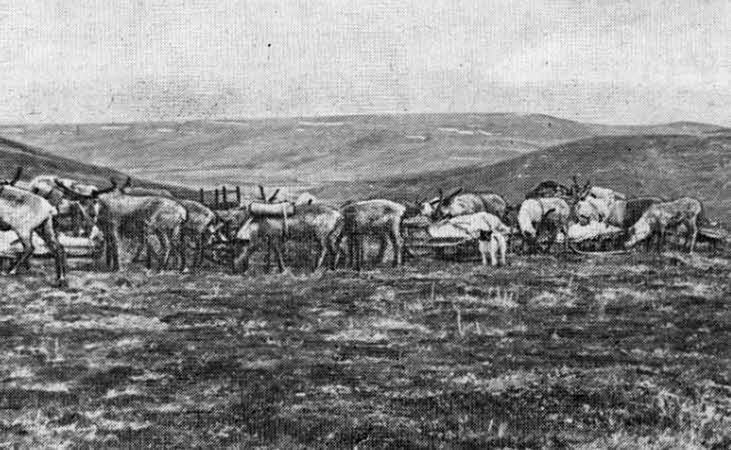 Рис. 14. Стоянка оленеводов. Жерди для чума срублены в южной лесотундре, лиственница для нарт — в северной тайге