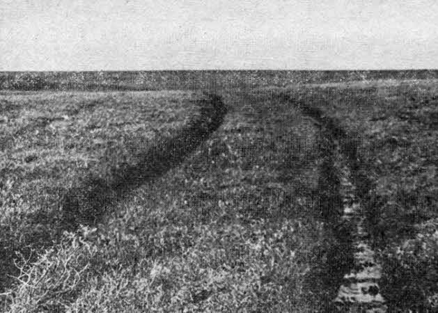 Приведем несколько примеров. По исследованиям сотрудников Магаданского филиала института «Росгипрозем» на зимних пастбищах Магаданского совхоза-техникума с пригодной площадью в 34 тыс. га вместо допустимой нагрузки в 1700 голов выпасалось стадо в 2100–2300 оленей. Это поголовье ежегодно выедало не менее 42 тыс. ц ягеля, в то время как ежегодный прирост составлял не более 32 тыс. ц, т. е. каждый год сверх допустимого изымалось 10 тыс. ц ягеля. В результате валовые запасы лишайников на этой площади снизились с 322 тыс. ц в 1957 г. до ИЗ тыс. ц в 1974 г. Ежегодный прирост лишайников тоже сократился — с 31 тыс. ц в 1957 г. до 11 тыс. ц в 1974 г.[10] Сильно выбиты лишайники на пастбищах Ямало-Ненецкого автономного округа Тюменской области. Почти во всех хозяйствах реальное поголовье оленей намного превышает оленеемкость закрепленных пастбищ, в результате чего запасы лишайниковых кормов резко сокращаются[11]. Поэтому в округе стали сейчас проводить мероприятия по стабилизации поголовья оленей. Подобная ситуация с лишайниковыми пастбищами в тундровой и лесотундровой зонах сложилась во многих районах Севера. В тундре и тайге сейчас работает огромное количество экспедиций, здесь сосредоточено много техники, которая нередко отрицательно воздействует на почвенно-растительный покров. Установлено, что один вездеход, пройдя летом по оттаявшей тундре всего 3 км, уничтожает до 1 га пастбищ (рис. 16). Но на Севере работают тысячи вездеходов, тракторов и другой транспорт, размолачивая оттаявшую тундру на тысячи километров. Вследствие этого площадь пастбищ неуклонно сокращается.