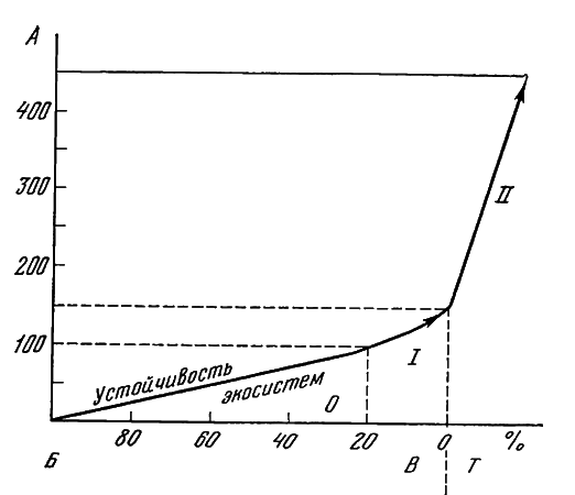 Рис. 17. Схема устойчивости экосистем Севера в зависимости от общей фитомассы (в ц/га) и обилия подземных льдов (в %): 0 — предельно неустойчивые экосистемы с подземными льдами (более 20 % от общего объема грунтов) и фитомассой менее 100 ц/га, т. е. все тундровые и почти все лесотундровые природные комплексы; I — неустойчивые экосистемы на вечномерзлых грунтах с фитомассой до 150 ц/га, т. е. лесотундровые и значительная часть таежных природных комплексов; II — слабо устойчивые экосистемы на преимущественно талых грунтах с фитомассой, не превышающей 450 ц/га, т. е. северотаежные природные комплексы А— фитомасса в ц/га: 50, 100… 450; Б — В — объем подземных льдов в вечномерзлых грунтах, в %; Т — талые грунты; ↑ — кривая устойчивости экосистем