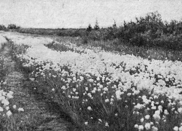 Рис. 25. Старая дорога, по которой ездили на деревянных нартах, широкие легкие полозья которых не разрушали почвенно-растительный покров. Наезженная в течение многих десятилетий дорога удобрялась экскрементами животных и теперь, когда поездки прекратились, заросла пушицей. Фото В. В. Уткина