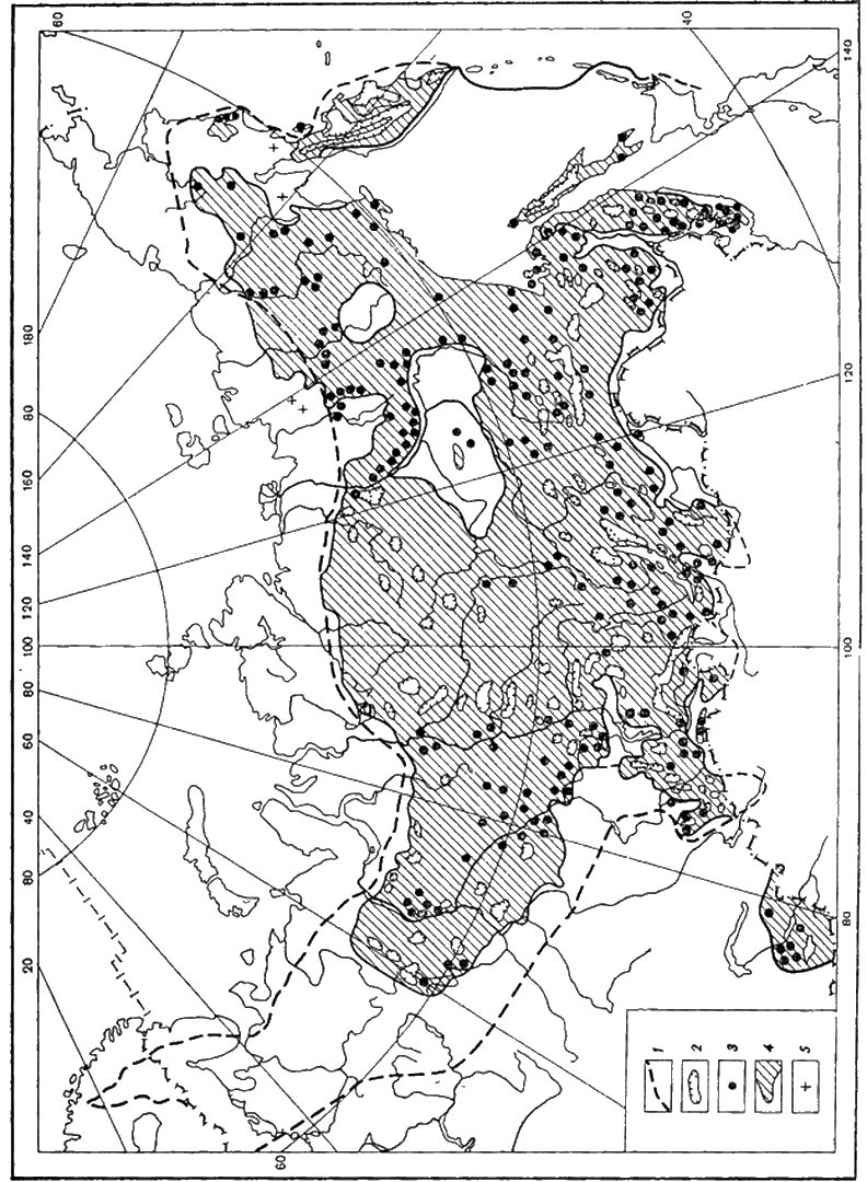 Рис. 26. Карта-схема распространения соболя (по С. И. Огневу, В. Г. Гептнеру, А. А. Вершинину): 1 — граница распространения соболя в начале XVII в.; на севере она совпадает с северной границей лесов; 2 — изолированные популяции соболя, образовавшиеся к 20-м годам XX в. в результате истребления зверьков. Соболь тогда встречался только в этих местах; S — основные места выпусков соболя (с 1928 по 1965 г. было выпущено более 19 тыс. соболей); 4—современная граница распространения соболя; южная и северная границы ареала примерно совпадают с границами XVII в.; западная — на 1300 км отстает от нее; 5 — отдельные микропопуляции и забеги соболей