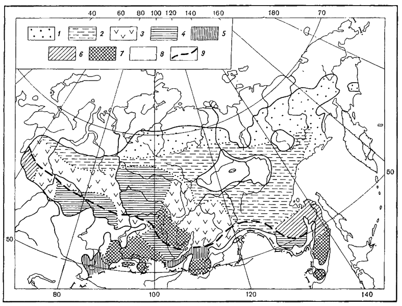 Рис. 27. Карта-схема современной заготовки шкурок соболей с 1000 га обитаемых угодий (по А. А. Вершинину): 1 —менее 0,1; 5–0,1–0,2; 3–0,23–0,32; 4–0,35–0,38; 5–0,43–0,46; 6–0,5–0,59; 7–0,6–0,7, 8 — более 0,7; 9 — южнее этой границы численность соболя заметно снижена