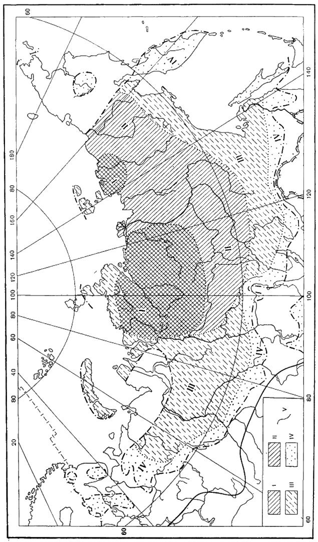 Рис. 28. Схема распространения дикого северного оленя (по А. А. Назарову и Б. В. Новикову): I — высокая и растущая численность оленей, обеспечивающая возможность интенсивного промысла на базе специализированных или комплексных хозяйств; II — более низкая, стабильная или немного увеличивающаяся численность оленей; здесь возможно развитие спортивной охоты на дикого оленя и лимитированный промысел его для нужд местного коренного населения; III — невысокая численность оленя, имеющая тенденцию к сокращению; поголовье животных необходимо охранять; местами возможна регламентированная спортивная охота; IV — малочисленные сокращающиеся популяции — по периферии ареала распространения диких северных оленей и в изолированных популяциях; необходима строгая охрана животных; V — южная граница ареала дикого северного оленя в XIX в. Границы домашнего оленеводства не совсем совпадают с ареалом дикого северного оленя: южная граница домашнего оленеводства в большинстве районов проходит на 100–300 км севернее южной границы ареала дикого оленя.