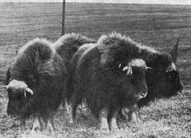 На советском Севере есть огромные пространства арктических и типичных тундр, не используемые ни одним видом копытных травоядных животных. Сюда заходит лишь северный олень, да и то на очень короткий летний период. С экологической точки зрения, эти тундры представляют собой свободную экологическую нишу. Суммарная площадь ее огромна — около 1–1,5 млн. км2. Давно уже советские ученые высказывали мысль о возможности и необходимости акклиматизации овцебыков и расселения их на этих арктических просторах. Овцебык — крупное копытное животное Арктики. Он хорошо приспособлен к экстремальным условиям обитания, довольствуется скудным растительным кормом. Вес животного равен 250–300 кг, наиболее крупных самцов — 500–600 кг. Тело компактное, на загривке имеется горб, конечности и хвост короткие. Самцы и самки обладают изогнутыми острыми рогами. Овцебык покрыт темной густой шерстью, которая на 60–80 % состоит из подпуши. Ость длинная — до 60–90 см, свисает по бокам тела почти до земли. Шерсть и мясо овцебыка отличаются высокими товарными качествами. Овцебыки — стадные животные (рис. 29). Они совершают незначительные кочевки, питаясь в основном травянистой и кустарниковой растительностью тундры.