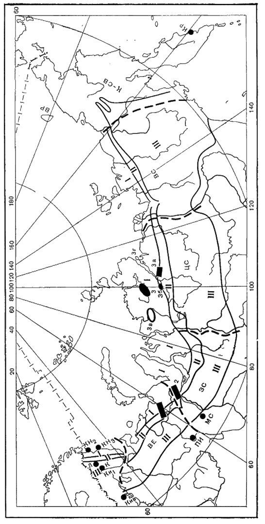 Рис. 31. Схема размещения заповедников и заказников на Крайнем Севере: Природные зоны: I — тундры; II — лесотундры и северных пред-тундровых редколесий; III — северной тайги Физико-географические природные провинции: К — Кольская, BE — восточно-европейская, ЗС — западно-сибирская, ЦС — центрально-сибирская, ВС — восточно-сибирская, К-св — Крайний северо-восток Азии, преимущественно горная страна, окруженная холодными морями Расположение заповедников и заказников, организация которых неотложна: 1 — Восточно-Европейский — от северной границы лесов до лесного о-ва на р. Море-Ю, расположенного в тундре; 2 — Западно-Сибирский (Ямальский) — от северной границы лесов до лесного о-ва Сопкай, расположенного в тундре на моренном ландшафте, 3 — Таймырский — в бассейне рек Верхней Таймыры и Логаты; 3а — филиал Таймырского заповедника в бассейне р. Лукунской, где находятся самые северные на планете массивы лесов на широте 72°34′ и самые северные лесные острова в тундре на широте 72°40′; 3б — лесной о-в Ары-Мас в долине р. Новой — 72°27′ с. ш.; 3в — Пуринско-Пясинский заказник, где летом концентрируется огромное количество диких северных оленей; 3 г — заказник в районе бухты Марии Прончшцевой. П — зоны лесотундры и предтундровых редколесий, которую необходимо выделить в ботанический заказник, чтобы предотвратить дальнейшее отступание границы лесов на юг и увеличение безлесных тундровых пространств. Существующие заповедники: НН — Кандалакшский; KH1 — Кандалакшская губа; КН2 — Айновы острова; КН2 — Семь островов; Л — Лапландский; Кив — Кивач; ПИ — Печоро-Илычский; МС — Малая Сосьва; Вр — заповедник на о-ве Врангеля; Кр — Кроноцкий