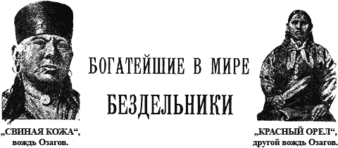 От редакции. Индейцы-озаги, влачившие до сих пор жалкое существование в покоренной европейцами местности, стали вдруг, по странному капризу судьбы, богатейшей в мире общиной. Каждый член этого племени имеет ежегодный доход в 8—12 тысяч долларов, т. е. в 16–24 тысяч рублей. Но деньги ничего не дают этим детям природы. И характерно: культурные угнетатели снабдили индейцев деньгами, но не могли привить им свою любовь и почтение к капиталу. Озаги простодушно и весело, поистине как дети, тратят безмятежно свои доходы, разбрасывая их кругом себя с примитивной простотой.