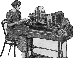 В этой машине, заменяющей собою целую типографию с десятками наборных касс и сотнями пудов шрифта, нет ни одной капли свинца и работа на ней не труднее и не вреднее, чем на пишущей машинке. При этом простота, точность, аккуратность и скорость работы прямо поразительны. Общий вид ее изображен на снимке и трудно поверить, что этот небольшой механизм способен заменить любую массивную наборную машину прежней конструкции и ряд обслуживающих ее шрифт-касс.