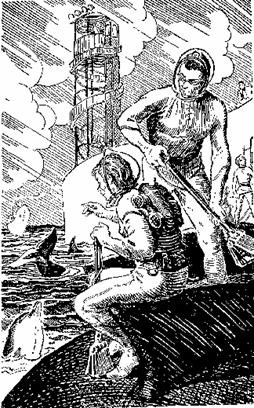 Доят маток китов два раза в сутки — в семь часов утра и в пять вечера. Со сторожевой башни подается ультразвуковой сигнал, и стадо с пастбища движется в лагуну, сопровождаемое дельфинами-пастухами. Сигнал можно и не подавать, киты и дельфины удивительно точно определяют время в любую погоду, да о сигнале, кажется, все забыли. Он работает автоматически уже много лет. Каждая матка идет к своему «стойлу» — причалу — и останавливается метрах в пяти. Она не прочь почесаться боком о шершавый базальт, хотя после нескольких несчастных случаев — киты сдирали себе кожу — им было запрещено прикасаться к стенке, за этим зорко следят дельфины. Наша Матильда похожа на субмарину одной из последних конструкций. Она относится к виду синих китов и весит двести десять тонн. Прежде, в давние времена, когда киты беспощадно уничтожались, редкие экземпляры синих китов едва достигали ста тридцати — ста пятидесяти тонн. Мало кто из этих исполинов доживал до зрелого возраста. Теперь же, после всеобщего закона, запрещающего охоту на китов, и особенно после перевода их на «пастбища», киты прибавили в весе на одну четверть. В нашем стаде есть китиха Малютка, достигающая чудовищного веса в двести восемьдесят пять тонн! К ласту нашей Матильды жмется ее сын Гектор. В сутки малыш выпивает несколько десятков литров молока, и все же у матери еще остается его достаточно. У нас с Костей маски Робба из кремнийорганической резины. Пленка толщиной в десять микрон, обтягивающая каркас маски, выполняет работу искусственных легких, через нее свободно поступает кислород, растворенный в воде, а углекислый газ уходит в воду, но этот процесс идет несколько медленней, и потому в маске есть еще специальный клапан для удаления водяных паров и углекислого газа. Маски Робба рассчитаны на плавание в пределах верхних горизонтов, не глубже двадцати метров. Пока они у нас сдвинуты на затылок. Сегодня у китов санитарный день. Мы расхаживаем по широкой спине Матильды с электрическими щетками и пластмассовыми лопаточками и очищаем ее необъятную спину от пленки диатомовых водорослей. Матильде эта операция, видимо, доставляет огромное удовольствие: она замерла и тихонько чуть поводит плавниками, время от времени из ее дыхала раздается мощный хлопок, как из клапана компрессора. На спине Матильды стоит тавро: Нептун с трезубцем и номер. В то время как мы с Костей расхаживаем по ее спине, Петя Самойлов и вьетнамец Као Ки занимаются дойкой. По прозрачным шлангам доильной машины бежит тугая желтоватая струя китового молока. Счетчик на стенке причала отсчитывает декалитры. Молоко уходит в недра острова, где подвергается стерилизации и упаковывается в портативные контейнеры из прессованной бумаги. На земле мало продуктов питания, которые могли бы приблизиться по своим удивительным свойствам к этому концентрату энергии. Трудно поверить, что было время, когда китов убивали, чтобы получить мясо, жир и кости. Мало того, что это было антигуманно, но и нецелесообразно. Уничтожалась даже по представлениям древних целая фабрика «эликсира здоровья», которая может работать десятилетия, требуя самой минимальной заботы со стороны человека. Когда я думаю об этом, то всегда вспоминаю любимую фразу Павла Мефодьевича: «Целесообразность — есть высшая справедливость»… Но сколько потребовалось усилий в