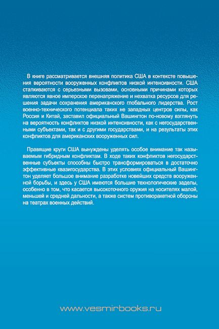 The Low-Intensity Conflicts in American Military-Political Strategy in the Early 21st Century In the Introduction (by V.I. Batyuk) the main attention is paid to the U.S. apparent imperial overstrain and the lack of resources to meet the challenge of preserving of American global leadership. The growth of military-technical potential of such non-Western centers of power as Russia and China, forced official Washington to take a fresh look at the probability of low-intensity conflicts with both non-state actors and with another state, and the results of this conflict for the U.S. armed forces. The low-intensity conflicts are forcing American military and political leadership to change not only doctrines, strategy, and operational art, but also weapons systems. In such conflicts the U.S. armed forces can face not only private, but also public and/or hybrid opponents, and in these circumstances, the American military could lose command of the sea, in the air and fire superiority on the battlefield. The American military-political leadership will have to reassess seriously its approach to low-intensity conflicts with non-state opponents. The extraordinary rapidity with which yesterday’s Donetsk and Lugansk militias have become a regular and well-organized army (the same transformation at the same time, in the spring and summer of 2014, occurred with the armed forces of the so-called “Islamic Statte”), is a brand new military-political factor, and American political and military leadership will have to reckon with developments in a similar scenario in other regions of the world. Chapter 1, “Prompt Global Strike: the US Strategic Systems and Low-Intensity Conflicts” (by T.B. Anichkina) considers the probability of use of American strategic and non-strategic carriers with high-precision warheads in the low-intensity conflicts. Since currently only the U.S. is capable of massive use of precision weapons with non-strategic carriers, Americans can take such a step in case of adverse development of the situation during the low-intensity conflict. High efficiency of application of precision weapons has been proven in practice on a number of criteria: accuracy, reliability, minimal collateral damage, the best ratio of “cost-effectiveness”, the impact efficiency for single and group (with the use of warheads with cluster combat gear) purposes. Meanwhile, in order to maximize the potential of the high-precision warheads, a high level of information support is needed. Currently, among individual countries, only the United States has so many of the WTO on non-strategic carriers to provide its massive use. Chapter 2, “US Missile Defense Concept and Low-Intensity Conflicts” (by O.O. Krivolapov) is focused on the probable use of ballistic missile by the U.S. military during low-intensity conflicts. According to the official documents on the US military policy, the use of missile defense systems is possible, first and foremost, in a regional context. From the point of view of many American high-ranking military, the ballistic missile defense is the central instrument of regional deterrence in such a conflict. Currently, all non-strategic Missile Defense elements both planned and already deployed in Europe, in the Middle East, and East Asia, can be used by the United States for regional deterrence purposes. A low-intensity conflict, in the opinion of the US military and political leadership, may arise, in particular, due to the fact that some countries may try to influence the decision-making of the United States through the threat of a missile strike on the territory of the United States, on the American troops, deployed in various regions of the world, or (more likely) on American allies. Chapter 3, “American military policy in Europe” (by V.I. Batyuk) examines the Washington’s attitude to the military balance there, on the European continent. In Europe, the U.S. and NATO leadership had had to abandon the condescending attitude of the Russian armed forces, rejecting the widespread belief of politicians and the military in the West that the modern Russian army is a pale shadow of the mighty and fearsome Soviet Army, and that under these conditions Moscow has to rely on the pitiful remnants of the Soviet nuclear arsenal to maintain its international status. The Crimea and Donbas have shown that the armed forces of the Russian Federation obtained great potential for both conventional war and low-intensity conflicts — and Washington and Brussels will have to reckon with this. The official Washington has to recon with not only a further escalation of a “hybrid” conflict in Ukraine, but also with the emergence of a similar conflict with its NATO allies in the Baltic States, which is fraught with unpredictable consequences. And, last but not least, the American nuclear strategy in Europe has undergone major revision: now there is no question about the elimination of American nuclear weapons in Europe. The Russian conventional superiority in Eastern Europe made the American nuclear warheads indispensable factor in ensuring the reality of the US and NATO security guarantees to the Eastern European members of the Alliance. Chapter 4, “The U.S. military policy in the Middle East” (by Y.V. Morozov) is focused on the American military and political strategy in that vast region. The author believes that one should not expect that under President Donald Trump the United States would reduce its involvement in the other countries’ domestic affairs. Policies and strategies carried out by previous U.S. administrations cannot be changed overnight. On the world stage in general and the Middle East in particular there would be further polarization between various centers of power. While America and the West defend the current unilateral world order with the dominant role of the United States, others will try to consolidate the emerging multipolar world. The Pentagon, being in readiness to use mi