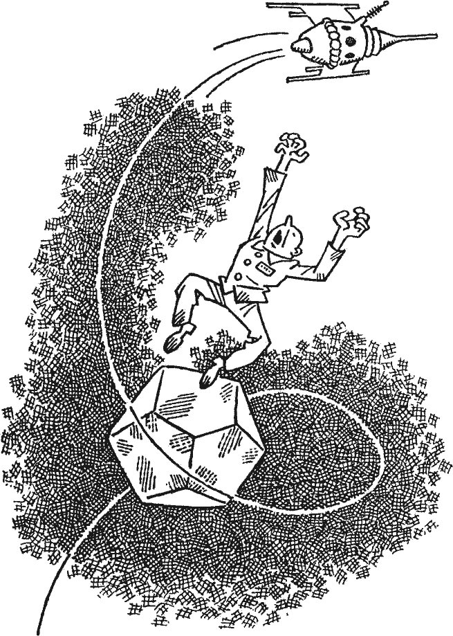 Толя стоял нахмурив лоб. Всё было напрасно… Всё-всё! Отцу и дела не было, что он целый месяц готовился к этому разговору. В этот день перед приходом отца Толя сидел в своей комнате и в последний раз обдумывал, с чего лучше начать разговор. Со стен на него смотрели разноцветные лица жителей других планет, нарисованные его другом Алькой: длинные, широкие, круглые, с одними, двумя и даже десятью глазами; с потолка свисали фиолетовые лианы, привязанные к проволочкам огненно-красные раковины и чучела невиданных птиц с расправленными крыльями; у стен лежали голубые, золотистые и чёрные инопланетные камни, большие, но такие лёгкие, что их запросто можно было отбросить через всю комнату щелчком; на полках стояли книги с очень тонкой бумагой — тысяча и больше страниц в каждой! — и с маленькой стрелочкой на переплёте: поверни — и страницы сами листаются с нужной тебе скоростью. Всё это привёз отец из космических командировок и подарил Толе, который с тех пор, как научился ходить, бредил иными мирами, ослепительными, неведомыми, диковинными… И вот Толя стоял в огромном кабинете, и отец повторял: — Нельзя, сынок… Разве ты не знаешь, что детям до семнадцати лет строго-настрого запрещено вылетать за пределы Солнечной системы? — Но почему, пап? Ты можешь сказать почему? — Как будто сам не знаешь, не читаешь газет, но слушаешь радио, не учишься в школе, где… — Слушаю! Понимаю! Учусь! И поэтому знаю, что этот запрет устарел… Может, ещё раз показать тебе книгу «Научные открытия, сделанные детьми за последние три года»? — Не надо… Толин отец был знаменитый учёный, автор многих книг, вице-президент Академии чешуекрылых. Он с детства был так увлечён своими бабочками, что никогда не расставался со складным сачком и даже дома изучал их. Самые редкие бабочки, известные на Земле всего в двух-трёх экземплярах, красовались в прозрачных коробочках, висевших на стенах отцовского кабинета. Они были причудливо разрисованы природой, и отец всегда с гордостью показывал их гостям. В шкафах и на полках его кабинета хранились коробочки с десятками тысяч бабочек Земли и разных планет, где побывали земляне; здесь же стояли сотни книг на разных языках Вселенной, посвящённых всё тем же бабочкам. И дня, казалось, и часа не мог прожить отец без них! Вот и сейчас он отвечал Толе и одновременно поглядывал в окуляр маленького электронного микроскопа, чтобы получше рассмотреть зубчатое крыло бабочки необыкновенно яркой фиолетовой раскраски. А Толя, бледный, тихий, большеухий, с блестящими глазами, стоял у стола и смотрел на отца. — Толя, — сказал отец, — нельзя так! Ну хочешь, я посажу тебя в звездолёт, который завтра в семь пятнадцать летит на Луну? — Не хочу я на Луну! Десять раз был там! Каждый камень и цирк знаю наизусть! Скоро там детские сады открывать будут и придумают скафандры для грудных… Там даже наш Жора был… — Надо было --">