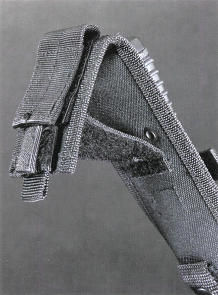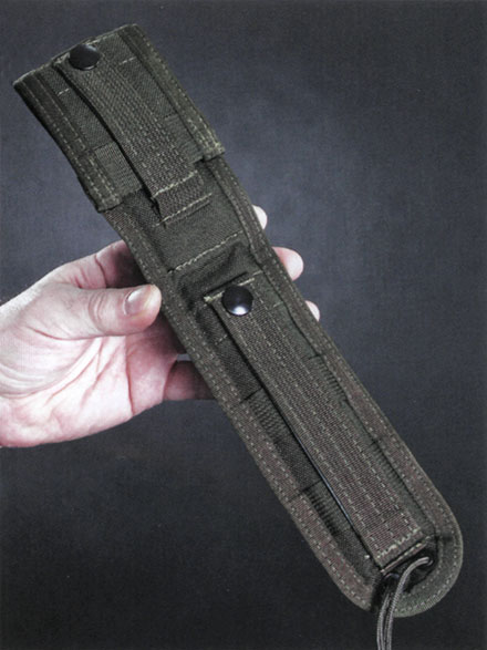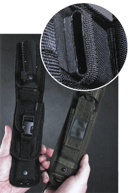 Ножны из толстой нейлоновой ткани Cordura обязательно должны быть оборудованы жестким вкладышем. Кармашек на наружной стороне цепляется за все, за что только можно зацепиться. При переползании — конечно, если настоящие герои унижаются до ползания, — в него забивается земля и всяческий мусор. Застежка, особенно на «репейнике» имеет обыкновение самопроизвольно и без предупреждения расстегиваться в самый неподходящий момент, отпуская на волю все, что в находится внутри кармашка.