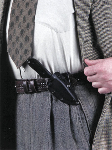 Жесткая пластмассовая клипса, удерживающая ножны на ремне практически неподвижно, хороша для сокрытия небольшого ножа под полой пиджака или короткой куртки. Надо только правильно подобрать место крепления и угол наклона ножен. Носить ножи побольше на таком высоком и жестком подвесе заметно менее удобно.