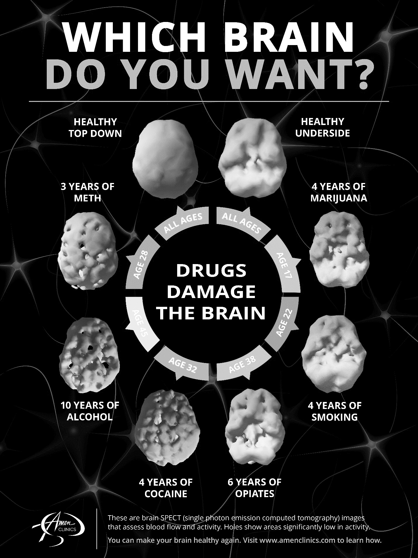 За последние 30 лет мы с коллегами создали крупнейшую в мире базу данных сканирования мозга, связанного с поведением. Мы провели более 160 000 сканирований мозга с помощью ОФЭКТ (однофотонной эмиссионной компьютерной томографии), которые измеряют кровоток и активность, и более 10 000 QEEGs (количественных электроэнцефалограмм), которые измеряют электрическую активность, у пациентов в возрасте от 9 месяцев до 105 лет из 121 страны. Наша работа по визуализации мозга полностью изменила то, как мы помогаем нашим пациентам выздороветь, и эта информация может помочь вам, даже если никто никогда не смотрит на ваш мозг. Человеческий мозг - это такой же орган, как сердце и все остальные органы, и вы можете быть психически здоровы только в том случае, если ваш мозг здоров функционально.