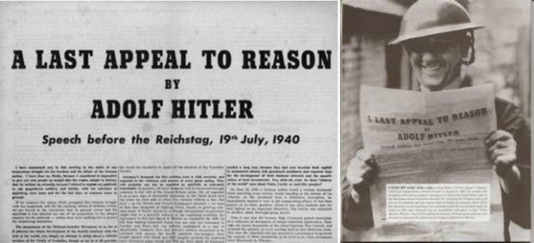 Поскольку Германия полностью контролирует континент и военное положение, Гитлер в ответ на бомбы Черчилля сбрасывает на Лондон огромное количество листовок. В этом 4-страничном информационном бюллетене на английском языке содержится краткое изложение недавней речи Гитлера перед рейхстагом. Речь озаглавлена «Последнее воззвание к разуму», которую он завершает заключительным призывом к миру: «В этот час я считаю своим долгом перед собственной совестью еще раз воззвать к разуму и здравомыслию как в Великобритании, так и где бы то ни было еще. Я считаю, что имею право обратиться с этим призывом, поскольку я не побежденный, выпрашивающий милости, а победитель, выступающий во имя разума. Я не вижу причин, по которым эта война должна продолжаться. Мне грустно думать о жертвах, которых она потребует. Возможно, мистер Черчилль снова отметет это мое заявление, сказав, что оно просто порождено страхом и сомнениями в нашей окончательной победе. В таком случае я смогу успокоить свою совесть в отношении грядущих событий». [20] Британцы отвечают на искренние предложения Гитлера насмешками, угрозами и новыми бомбами.