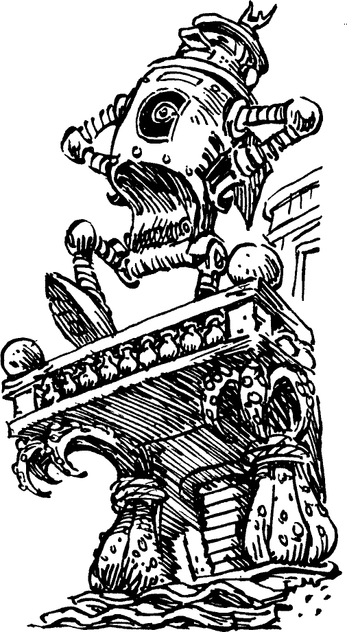 Вернувшись из зверинца в тронный зал, Великий Полководец отдал распоряжение вызвать нового начальника крепостных ворот, отослал писца и после этого подошел к Цицерону. Прикованный цепями гигант более чем вдвое был выше правителя страны. Он походил на какое-то жестокое божество из другого мира, и Великий Полководец едва заставил себя перебороть страх и подойти к роботу. — Вот оно — магическое красное пятно, — пробормотал он, разглядывая кнопку на груди у Цицерона. — Без него заклинание не подействует, и оно не действует без заклинания… если, конечно, двуногий меня не обманул.