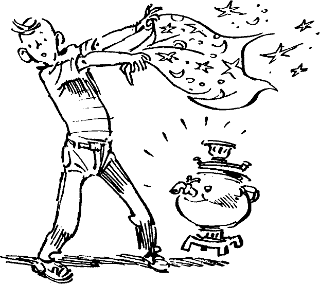— Чего-чего? — не понял продавец. — Арбузы, говорю, у вас хорошие. Взвесьте-ка мне, любезный, килограммчик кукумис сативусов. — Че-го, че-го? — опять спросил торговец. — Килограмм огурцов, — пояснил коротышка. — И пучок аллиум цепы. — Че-го-о, че-го-о? — совсем опешил продавец. — Слушай, я не понимаю твой шурум-бурум. Говори по-человечески. — Эх, — вздохнул коротышка. — Совсем не знают у нас латыни. Килограмм огурцов и пучок луку. — Вы ботаник? — спросил у него Алеша. — Совершенно верно, молодой человек. Я профессор ботаники, — ответил коротышка. — И что, вы помните все названия растений на латинском языке? — изумился Алеша. — Все, — вскинув голову, ответил ученый. — Клянусь знаменитой Канарской драценой драко, что означает драконово дерево с Канарских островов. А вы просто так интересуетесь или желаете получить квалифицированную консультацию? — Просто так. — Алеша пожал плечами и, извинившись, отошел. Проходя мимо фокусника, Алеша с друзьями остановились среди таких же зевак. Молодой человек как раз пытался достать из атласного цилиндра кролика, но зверек застрял в специальном столе, на котором стояла шляпа. Иллюзионист тянул кролика за уши, а зрители, поняв секрет фокуса, смеялись и давали ему советы: «Ты ему морковку покажи, сам выскочит»; «Вначале надо было выдрессировать кролика, а потом в стол запихивать»; «Да вынь ты его из стола, мы отвернемся». — А что, Фуго, — вдруг сказал Алеша. — Может, покажем этому неумехе, что такое настоящий фокус? — Я не умею, — ответил мимикр. — Ерунда, — махнул рукой Алеша и зашептал ему на ухо: — Видишь у него большое черное покрывало? Я тебя накрою, скажу какую-нибудь белиберду, потом сдерну тряпку, а под ней… — Я все понял, — перебил его Фуго и засмеялся от удовольствия. — Давай попробуем. Уговорить рыночного иллюзиониста одолжить на минуту покрывало было пустячным делом. Молодой человек оказался покладистым. Он даже предложил свой специальный столик с секретом, но Алеша отказался и ответил: — У нас с прадедушкой все по-настоящему. — Это точно, — подтвердил Фуго. — У нас в Саратовской области фокусы показывают без обмана. Давай-ка, правнучек, начнем. Как и полагается, Алеша показал зрителям обе стороны покрывала, а затем очень артистично набросил его на присевшего Фуго. — Уважаемая публика! — подражая цирковым артистам, начал Алеша. — Все вы видели, что под этим покрывалом сидит мой прадедушка Аристарх Поликарпович. Сейчас я скажу несколько магических слов, и он превратится в… — В самовар! — пошутил кто-то в толпе. — Можно и в самовар, — согласился Алеша. Он нагнулся к Фуго, взял покрывало двумя пальцами за середину и, завывая, проговорил: — Заклинаю тебя Цицероном — грозой тимиуков и мармуков. Превратись в самовар. — И совсем тихо пояснил для мимикра: — Помнишь, на веранде стоит, блестящий такой? — Помню, — едва слышно ответил Фуго и скомандовал: — Снимай! Для эффекта сделав несколько пассов, Алеша оглядел зрителей и сорвал с Фуго покрывало. Первые несколько секунд публика ошалело разглядывала большой блестящий самовар, затем кто-то захлопал в ладоши, и тут же все подхватили аплодисменты.