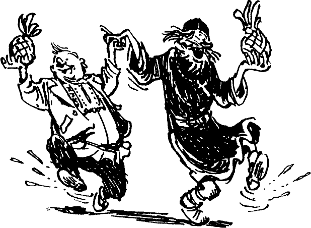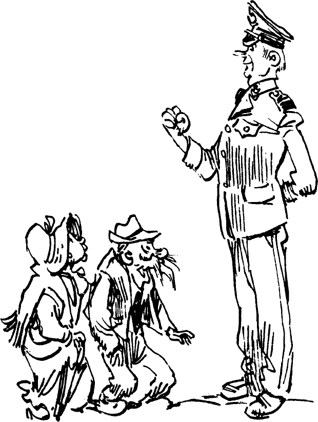 По толпе прокатился ропот. В первом ряду упала в обморок какая-то очень впечатлительная девушка. У пожилой дамы сорвалась с поводка и с диким воем убежала комнатная собачонка. А когда Фуго для пущей правдоподобности еще и зарычал, передние ряды в страхе подались назад, тогда как сзади все время напирали. Понимая, что фокус может стать причиной несчастного случая, Алеша быстро накрыл неизвестное чудовище покрывалом и крикнул: — Именем Цицерона — грозы тимиуков и мармуков, стань опять Никанором Захаровичем. Когда из-под покрывала вышел все тот же маленький старичок, зрители так усердно принялись бить в ладоши, что со всех деревьев в округе слетели несколько сот ворон и с громким карканьем закружили над рынком. Фуго с Дариндой стояли красные от смущения и гордости. Тетушка бормотала слова признательности зрителям, а на лице у Фуго играла блаженная улыбка. — Это ерунда, — тихо сказал он. — Это для меня раз плюнуть. У нас на планете такое может каждый ребенок. — Но публика так громко выражала свое одобрение, что его слов никто не услышал. В благодарность за необычное представление торговцы буквально завалили Алешу и двух «старичков» самыми отборными фруктами. Для того чтобы унести подарки, понадобился бы целый грузовик, и Фуго страшно расстраивался из-за того, что у них с собой всего две сумки. Особенно ему было жалко огромный арбуз, который им подарил бородатый торговец в теплом ватном халате и тюбетейке. — Спасибо, — поблагодарил продавца Алеша. — Мы бы взяли, но не дотащим его до дома. — Тогда давайте возьму я, чего добру пропадать, — вдруг сказал толстый гражданин. Он схватил арбуз под мышку и быстро пошел к выходу. — Эй, эй! — крикнул ему продавец. — А ты умеешь фокусы показывать? — Я? — обернувшись, удивленно спросил незнакомый гражданин. — Конечно, умею. Но вначале я отнесу арбуз домой, а потом вернусь и покажу. Сумки оказались такими тяжелыми, что Алеша едва оторвал их от земли.
