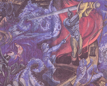 Я задыхался, легкие мои разрывались. Борьба с сетью, обвившей меня, ни к чему не привела. Люди моря плавали вокруг меня. Очевидно, они могли дышать в воде. Они смеялись и издевались надо мной, искренне радуясь тому, что я задыхаюсь. Они, наверное, думали, что очень глупо с моей стороны не иметь жабр. И только я решил, что со мной уже все кончено, как произошло что-то странное. К моим захватчикам присоединились двое детей Ллира еще более высокого роста. Они принесли какую-то маску и что-то приказали жестом, а мои захватчики подплыли ко мне. Один из них достал нож; я решил, что сейчас он убьет меня, но он разрезал сеть, освободив мою голову, оставив руки связанными. Те двое подплыли ко мне, подняли маску и одели мне ее на голову. Маска плотно облегла плечи, затем послышался свистящий звук — вода из маски исчезла, так что я смог вдохнуть воздух. Насколько мне его хватит? Внутри маски его было совсем немного, всего на несколько минут, и если они хотят спасти меня от удушья, то эта маска бесполезна. Но я недооценил их. Один из больших детей достал надутый пузырь, принадлежащий какому-то большому чудовищу, закрепил пузырь на маске, и я стал дышать горячим, пахнущим рыбой воздухом. Потом меня потащили еще глубже. Я почувствовал, что давление увеличивается, и подумал о том, знают ли они, что мне не выдержать больших давлений океанских глубин. И их маска не спасет меня. Потом мне пришло в голову, что хотя они имеют жабры, могут дышать в воде, но тела их тоже не способны переносить большое давление. Тем временем они погружались и погружались. Вокруг меня было примерно двадцать детей Ллира. Одни тянули сеть, в которую я был завернут, другие кружились вокруг, выполняя функции охранников. Вскоре я увидел, от кого они нас охраняют. Два существа, ужасные, похожие на акул, бросились на нас из скопления морских кактусов. Я хорошо видел их пасти и острые зубы. Если бы на их мордах могло быть какое-нибудь выражение, то оно бы, наверное, означало предвкушение вкусного обеда. Охранники сразу начали действовать. Один малыш с сетью и трезубцем отвлек внимание первого чудовища, помахав перед ним сетью. Акула повернулась к нему, открыв пасть, и тут же на нее с двух сторон были наброшены сети. Чудовище заметалось, стараясь высвободиться, но от этого сети затягивались еще крепче. Так как меня схватили таким же образом, я невольно почувствовал симпатию к акуле, но очень сомневался в том, что ее ответные чувства ко мне были такими же. Я видел, как люди моря быстро разрезали тело акулы на куски, и ее чернильная кровь окрасила воду вокруг нас. Другая акула была умнее или счастливее первой. Она, не обращая внимания на отвлекающие маневры, бросилась прямо в скопление воинов, и ее огромные челюсти сомкнулись на ноге одного из них, когда тот пытался ускользнуть. Сверкающие зубы отрезали ногу, как бритвой. Потом на акулу набросились остальные дети Ллира и выиграли битву, потеряв еще одного человека. Когда битва закончилась, они снова потащили меня. Я не имел ни малейшего понятия, насколько глубоко мы опустились, но давление заметно увеличилось. Вскоре мы прекратили спуск и дети Ллира поволокли меня над песчаным дном, покрытым морскими растениями. Мы пробрались через коралловый лес, пересекли гряду подводных холмов, а затем спустились в долину. И тогда я увидел город. Он был весь розовый и золото
