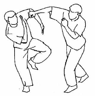 Заметьте, что всякий раз положение ваших рук и ног может быть иным (в зависимости от выполняемой против вас атаки). Если, например, атака противника направлена в верхний уровень, то «плотность» вашей защиты должна быть более сосредоточена именно сверху. Если — справа, то ваша защита должна быть усилена дополнительным разворотом туловища вправо и подъемом одноименного плеча и т. д. Научившись пресекать атакующие действия универсальной защитой, переходите к следующему этапу. Позиция, которую вы используете для защиты, должна быть очень устойчива, ведь вы находитесь при этом на одной ноге. Попросите своего напарника несильно толкать вас руками. Пытайтесь сохранять устойчивость! Вы можете отпрыгивать в направлении толкания или даже менять опорную ногу. Хорошим вариантом парной наработки позиции, соответствующей универсальной защите, являются одновременные толкания друг друга при прыжках на одной ноге. Данное упражнение развивает особую устойчивость у бойцов при столкновении. Помните только о необходимости высокого удержания согнутой в колене ноги, чтобы закрывать ногой низ живота и опорную ногу.