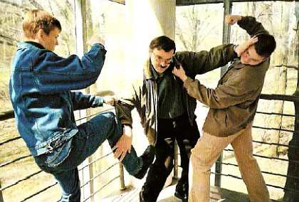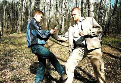 Запомните, что все атаки должны быть неожиданными! На близкой дистанции можно атаковать либо коленом в пах, либо стопой по голени, либо кулаком (или локтем) в голову. В зависимости от последующей реакции противника необходимо продолжать внезапную атаку, учитывая изменившееся положение тела, открывшиеся зоны и многое другое. Такую наработку мы называем внезапными атаками с «продолжением». Обратите внимание, что удар коленом делается с резким приседанием вниз, тогда он получается сильным и неожиданным. Атаковать можно также голень противника ударом внутреннего свода стопы, если противник находится прямо перед вами, или же ребром стопы, если он стоит сбоку. Ноги противника могут быть предварительно укреплены набивкой, но удары в обуви (особенно с жесткой подошвой) легко травмируют их, а если вы добавите еще скользящее движение ребром стопы вниз по голени, то противнику мало не покажется. Ударить в голову можно дугообразным движением сбоку, используя основание ладони. Сразу после этого выполните повторную атаку с другой стороны. Если же противник успеет среагировать на ваши движения, то используйте «вязкую» атаку, захватите его руки и ударьте ногой, потянув на себя. Очень эффективны при внезапных атаках кистевые удары в область лица противника. Различные «веера» и «гребни» шокируют противника своей неожиданностью и силой! В случае если противник все же успеет каким-то образом парировать ваши атаки, вы не должны останавливаться. Необходимо продолжать свои атаки, переходя уже к другим формам ударов. Мы не будем рассматривать сейчас множество других атак, с ними вы познакомитесь чуть позже, а отметим лишь следующее. В реальной схватке могут использоваться и любые подручные предметы. Их применение позволяет добиться превосходства над более сильным, крупным или подготовленным противником. Внезапные атаки могут быть замаскированы вполне «невинными» движениями. Например, поправляя прическу или делая вид, что сморкаетесь, неожиданно нанесите удар в лицо или в пах своего противника. Чтобы защититься от внезапных атак, необходимо помнить следующее. Если вас окружают, не стойте на месте и контролируйте дистанцию. Перемещайтесь так, как удобно вам. Это будет помехой нападающим. Если чувствуете неизбежность схватки, бейте первым, берите инициативу в свои руки, но не бейте так, чтобы разъярить противника. Ваши удары должны быть такими, чтобы те, кого вы атакуете, больше не смогли участвовать в схватке. Такие удары возможны, если используется принцип «внутренней (или скрытой) наковальни», который описывается в отдельной главе. Если же вы видите, что атака уже выполняется против вас, то мгновенно используйте универсальную защиту и, выполнив ее, тотчас переходите к атакующим действиям! Универсальная защита идеальна против любых внезапных атак (включая далее атаки противника, вооруженного дубинкой или ножом), так как она позволяет перекрыть все возможные траектории ударов. Можно использовать также скрытые формы защиты, или определенные положения тела, которые естественны и не вызывают никаких подозрений у нападающего о вашей готовности к бою. Старайтесь избегать фронтальных позиций и стойте чуть боком к противнику, тогда самые важные зоны вашего тела становятся более защищенными. Одну руку держите чуть поднятой, будто вы хотите жес