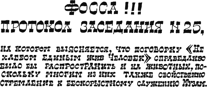 ФОССА !!! Протокол заседания №25, на котором выясняется, что поговорку «Не хлебом единым жив Человек» справедливо было бы распространить и на животных, поскольку многим из них так же свойственно стремление к бескорыстному служению Музам.