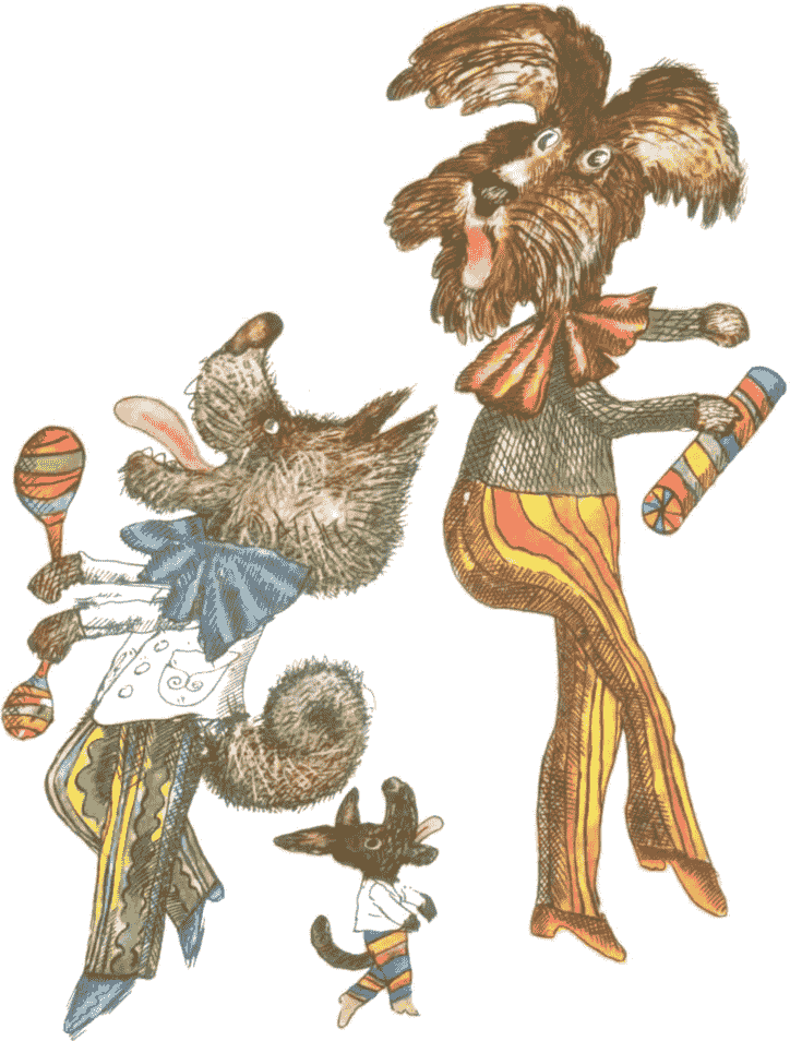 Сова (тихо). Это что же, они все время так реветь будут? Рак. Тогда и мы все заревем. Человек. Я в этом не уверен, Рак: многие находят, что хоровой рев этих южноамериканских обезьян довольно благозвучен и в нем есть ритм… Мартышка. Конечно, есть — у них же в горле костяной барабан, не говоря уже о шести воздушных мешках! Гепард (продолжает объявлять). Трио Волков. Как известно, волчий вой представляет собой последовательность чистых музыкальных тонов, которые образуют настоящую мелодию! Человек. Верно, музыканты тоже так считают.