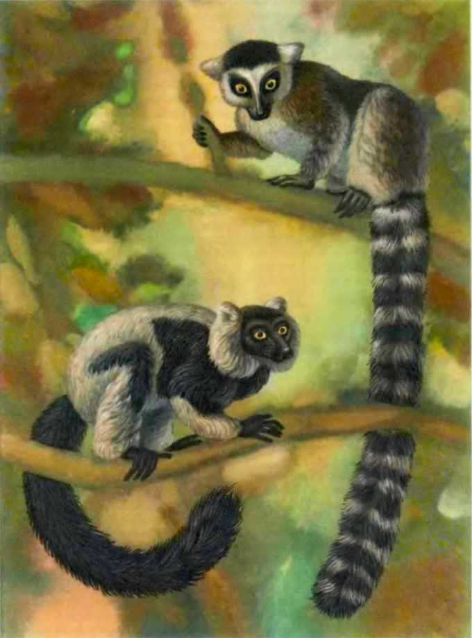 <<< Если бы у канатоходцев был такой хвост, им не пришлось бы пользоваться шестом, чтобы сохранять равновесие. Балансируя хвостом, лемур вари (сверху) и кошачий лемур, он же катта, быстро перебегают по горизонтальным веткам. Увы, не всегда это спасает их от фоссы…