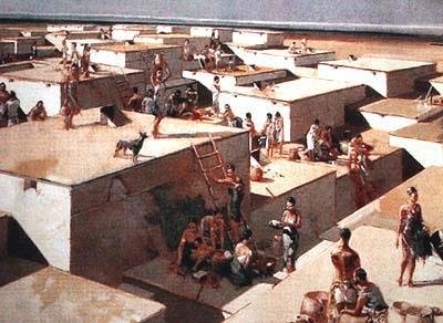 Древнейшая цивилизация мира зародилась на территории Ближнего Востока, в так называемом Благодатном Полумесяце, что охватывает территории современных Египта, Сирии, Израиля, Турции и Ирака, родине дикорастущих ячменя и пшеницы. Именно там, в пригодной для земледелия зоне, (с уровнем осадков более 200 мм в год), появились первые земледельческие поселения, а затем и города. Это на самом деле была благодатная земля, в условиях более тёплого и влажного климата побережья и острова средиземноморья зеленели широколиственными лесами, кипарисовыми и кедровыми рощами. Только за тысячелетия вырубок леса для выплавки металла, земледелия и выпаса скота эти земли превратились в сегодняшние полупустыни. Один из самых первых посёлков был построенный на рубеже IX–VIII тыс. до н. э. Иерихон на месте где Иордан впадает в Мёртвое море. Маленький городок, площадью около трех гектар, был обнесён каменой стеной и рвом, в его центре стояла восьмиметровая башня с хранилищем зерна и цистернами для сбора воды. Расположенные за стеной дома строили из сырцового кирпича, их покрытые известковой штукатуркой полы, как и стены часто красились в красный или кремовый цвет. Жители, около двух тысяч человек, возделывали пшеницу-эммер и ячмень, пасли мелкий рогатый скот. Интересно, что после собаки и козы третьим домашним животным стала кошка — запасы зерна нуждались в защите от грызунов. Земледелие в их обществе вытесняет собирательство и становится поливным. По прежнему большое значение играла охота, люди пользовались костяными и каменными орудиями, не знали керамической посуды, но умели делать глиняные статуэтки богини — матери. Древняя пшеница-эммер (полба) отличается от выведенной из нее современной тем, что при молочении её плотная шелуха не отстает, поэтому её надо сначала растолочь, а затем просеять. Лепёшки делали из муки, приготовленной на каменных зернотёрках, а это тяжелая работа, так что мука была предметом роскоши. Бедняки предпочитали варить кашу из крупы, в которой неизбежно присутствовали частицы камня от зернотерок, от этой грубой пищи истирались зубы. Высокой была детская смертность, средний возраст не превышал 20 лет. (Даже во времена античности треть всех младенцев умирала от рождения до года, половина из оставшихся не доживала до 5 лет). Мёртвых закапывали прямо под полом жилища, вернее обезглавленные скелеты, головы как вместилище души, хоронили отдельно. Черепа наполняли и обмазывали глиной, воссоздавая черты лица, в более поздних захоронениях на головы мёртвых надевали ритуальные маски из гипса с глазами из раковин каури. Эти раковины доставляли с берегов Красного Моря, Иерихон был центром меновой торговли, местную соль Мёртвого моря обменивали на бирюзу с Синая, анатолийский обсидиан и нефрит. Накопленные богатства вызывали зависть и нападения соседей, первоначально неукреплённое поселение было превращено в мощную крепость. Его окружал широкий (8,5 м) двухметровый в глубину ров, а каменные стены достигали более 5 метров в высоту и около двух в толщину. Расположенный в Малой Азии, Чатал — Гуюк (конец VII — начало VI тыс. до н. э.) возможно самый большой город тогдашнего времени, с населением до 6 тысяч. В ходе его раскопок найдены кинжалы из кремня тонкой и искусной работы, каменные навершия булав, наконечники стрел и копий из обсидиана (вулкан